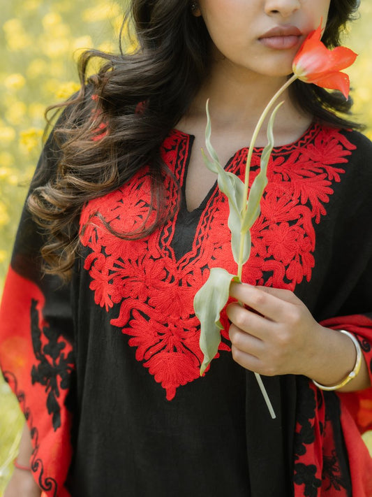 Midnight Noir Cotton Kaftan with Scarlet Flame Aari Embroidery