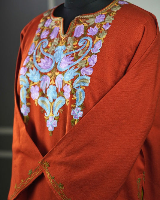 Kashmiri Aari Embroidered Phiran – Light Blue , pink and brown| Rust