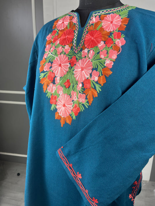 Kashmiri Golden , pink , green and red Aari Embroidered Phiran | deep blue