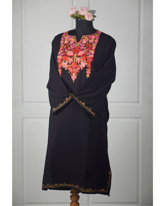 Kashmiri Aari Embroidered Phiran – Pink, Brown & Red | Black