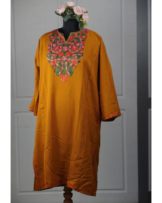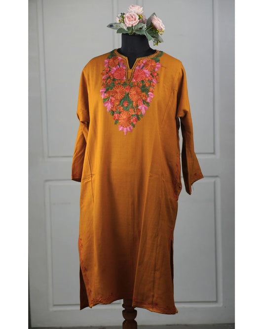 Kashmiri Aari Embroidered Phiran – Brown, Green & Pink | Mustard