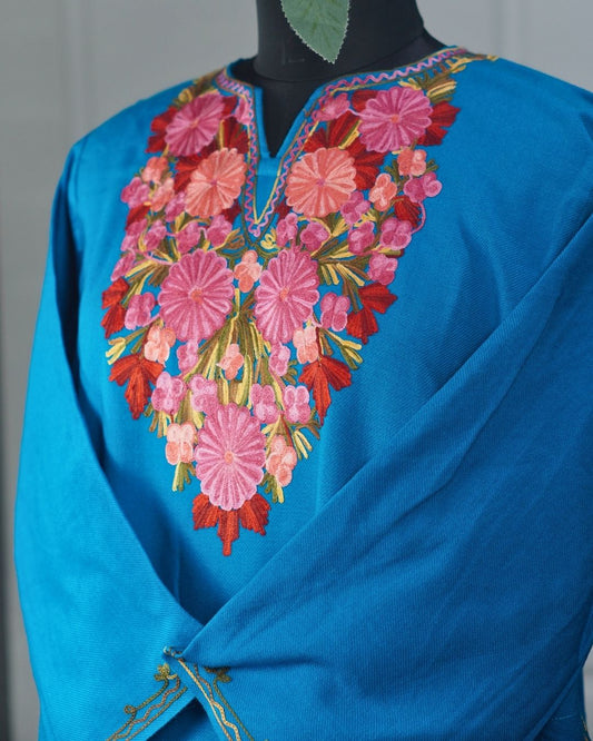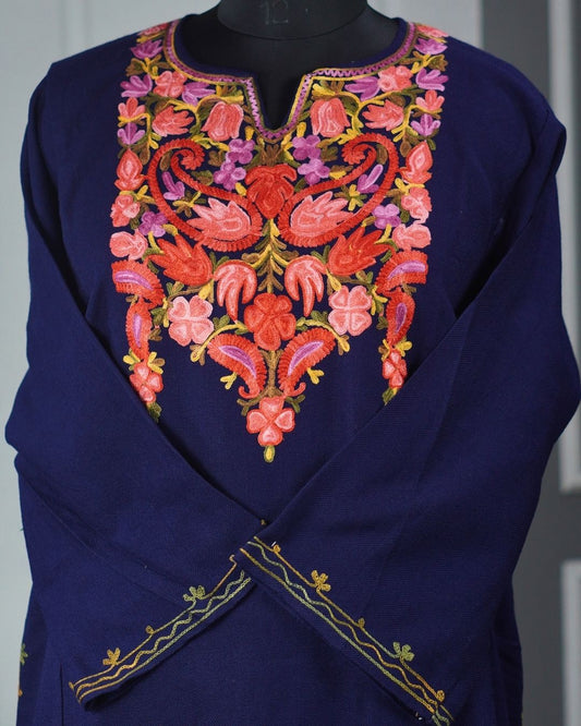 Kashmiri Aari Embroidered Phiran – Pink, Red, Green & Brown | Indigo Blue