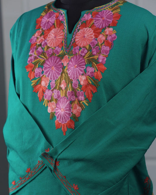 Kashmiri Aari Embroidered Phiran – Pink, Red & Green | Turquoise